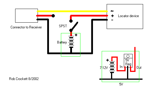 For the Locator I and Locator II, you can use a regular square 9V transistor radio battery. The alarm will be really loud, and the battery will last for a very long time though the battery is a bit hefty. Radioshack sells the 9V battery connectors (part 270-324) if you cannot scavenge one from one of your kid’s old toys. If you use a 9 volt battery, be VERY sure that you do not connect it directly to your receiver, or you will release the magic blue smoke from your receiver.