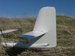 silicone-hinged with internal balsa wipers, and the molded rudder has an