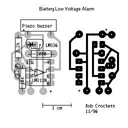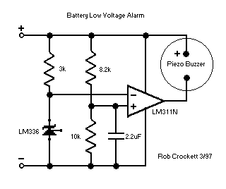 This device of my design uses seven componants on a single side PC board. With a 6 inch connector, the whole thing weighs about 0.2 oz. The alarm sounds with a voltage at or below 4.5v, and the circuit draws 2.4-2.7 mA when quiet and 5.6mA with the alarm (in my Hitec system, a receiver and two servos draw an average 75-100mA when flying). The LM336 and 3k resistor provide a precision reference 2.5 volts, and the two other resistors are a voltage divider that provide the sample voltage. The LM311 is a voltage comparator, and powers the buzzer when the sample voltage crosses the reference. Since servos draw current abruptly and intermittantly, the ambient battery voltage is puncuated by a series of low voltage spikes. The capacitor (not in the original design in the picture) smooths these spikes somewhat so that the alarm does not chirp with every servo motion. These inverted voltage spikes are not so pronounced with larger capacity batteries; the capacitor may not always be be needed. While it is possible to smooth the voltage completely, this chirping provides a continuous and early indication of battery voltage. With the circuit here, the alarm chirps while slewing both servos of a reciever/two servo system when a 150mA battery is about half discharged, chirps with any servo motion when near completely discharged, and alarms continuously with about 5 minutes of flying time left. With a larger capacity battery, the sequence occurrs much nearer to complete discharge--perhaps no capacitor or a smaller one (say 1uf or 0.1uf) would do--and initial comparison with your measured voltages would be important to calibrate to your system. You can adjust the divider resistors for a higher or lower voltage alarm: Vout=Vin(R2/(R1+R2)) where Vout=2.5v and Vin is your selected alarm voltage, and R1 is the positive side and R2 is the negative side. Note that the LM336 has three pins and you only use two (break off the third). Solder a battery or servo connector to the board with positive and negative as shown, and plug the connector into an unused slot in your receiver.