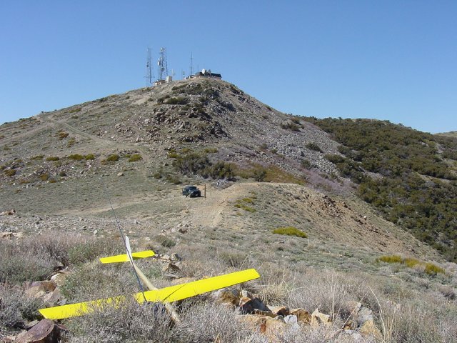 Flying and Cautions: Rocks are everywhere with little foliage to cushion a landing, so . . . think about a landing zone well in advance, and make a few passes to check out the wind in your landing zone before you ease it in. This site is at about 8000 feet—use suntan lotion and a hat or you will get fried. At these higher altitudes, your plane will fly noticeably faster and need less ballast. Those radio towers are not there for decoration—they can pump out megawatts of RF energy that can interfere with your R/C system. Also, your transmitter signal can reflect from the metal radio towers and cause frame misread interference in your plane’s receiver, so keep your plane closer to you than the antennae farms. One time on this site with a passing squall, my car antennae was snapping with energy, and the thunder scared the @&#* out of me as I dove into the car for cover.