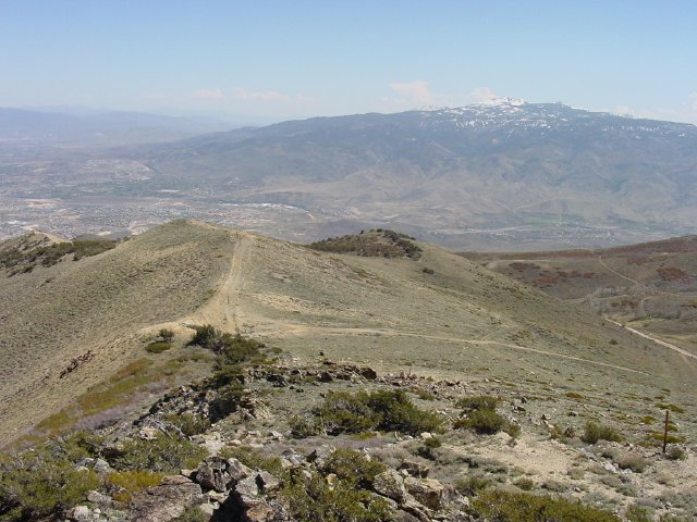 Location: Find yourself near the intersection of I-80 and I-395 in Reno, Nevada. Go about 8 miles north on I-395, and turn off on Stead Blvd. At the stop sign, turn left/west and go under the freeway. Drive the quarter mile to the stop sign, and turn right/north on the frontage road. Drive 0.5 miles on the frontage road, and turn left/west onto the broad bumpy dirt Peavine Road up the hill next to the blue house and just before the large squat green water tank. Cross the railroad tracks, and follow the road southwest around the south side of the summit. Stick to the well-traveled dirt road, and follow it about 6 miles to the summit.
