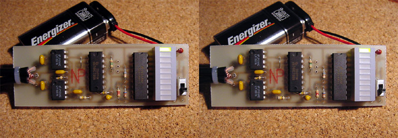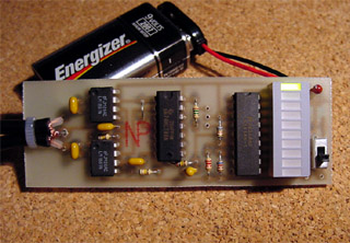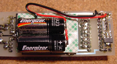 Attach power to the board in the right lower corner. The circuit runs at 5v and the LM3914 needs at least 5.3 volts to regulate at 5v, so you can use the 9v battery clip and 9v battery that will last forever. (The prototype in the pictures used a surface mount voltage regulator instead of the TO-92 specified above). To cut a little weight, you can use a smaller 6v camera battery (Energizer A544 alkaline or L544 lithium), or an even smaller 12v garage door opener battery (Energizer A23)--you can solder directly to the terminals of the battery after sanding the terminals a little, or put a glob of solder on the coiled end of the wires and tape the wire over the ends of the batteries (much easier to change in the field).