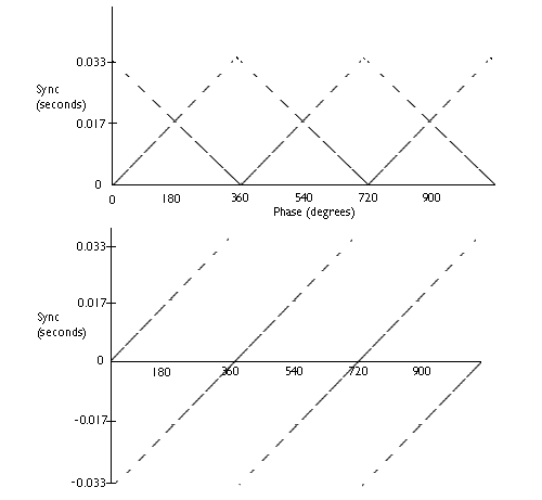 Unless you are a math wiz, the equations may not be easy to visualize, so here is a graph to demonstrate. Time or sync phase are on the horizontal axis, as the sync will slowly change over time since the timing reference crystals in the two cameras are not exactly the same. The vertical axis is the difference in time between each of the twin camera exposures. If you keep track of which camera is which (one master, the other slave), and plot (sync time)=(master-slave), the result is the second graph, which agrees well with experiment (John Hart's twin Nikon digital camera sync data) . The slope direction (positive vs negative) in the second graph depends on which of the two camera crystals is faster.