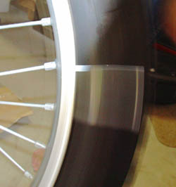 Flash Sync: Flash sync is shutter sync with a slight twist. The flash occurs at the start of an exposure just after the shutter opens. To prove this to myself, I put a motorcycle on a stand, put a thin strip of reflective tape at intervals around the tire, and had my daughter spin the wheel clockwise while I tried to take a picture of the tire at 1/30 sec while blocking half from the flash with a card. The photo shows the sharp flash reflection at the very origin of the more vague blurred remaining exposure. From measurements of flash and camera video cycle sync using exposures with the Sync Shepherd connected, the flash seems to occur with these cameras about 0.35 msec or 1/2800 sec after the shutter opens.